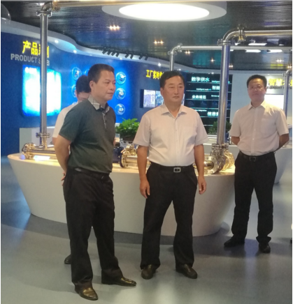 【李董事长(右二)陪同谭主任(左一)参观展厅】